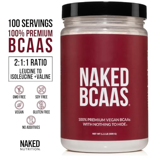 NAKED BCAAs Amino Acids Powder, Only 1 Ingredient, Pure 2:1:1 Formula, Vegan Unflavored Branched Chain Amino Acids, Instantized All Natural BCAA Supplement – 500 Grams, 100 Servings