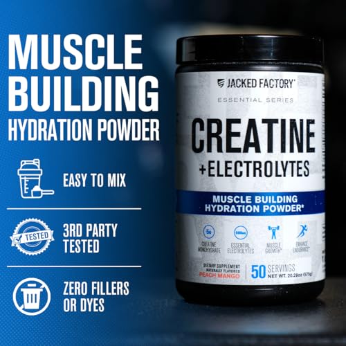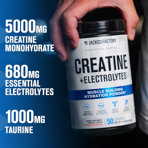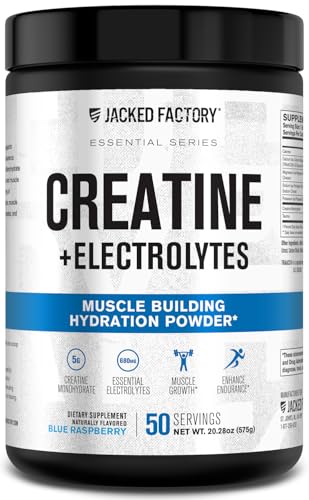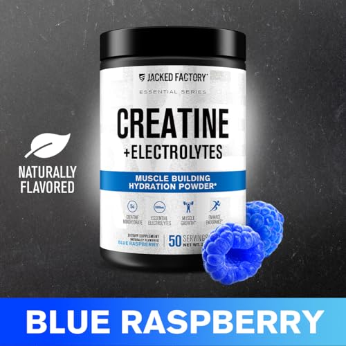 Jacked Factory Creatine + Electrolytes – Creatine Monohydrate with Taurine, Calcium, Sodium, & Potassium to Increase Muscle Growth, Strength, Hydration, & Endurance – 50 Servings, Blue Raspberry