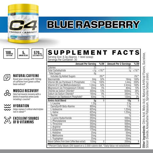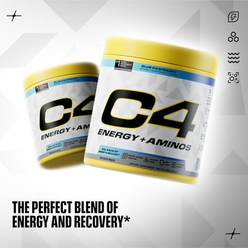 Cellucor C4 Energy + Aminos Powder | 5g BCAAs & EAAs for Muscle Recovery, 3 Electrolytes for Hydration, 100mg Natural Caffeine | Pre Workout | Zero Sugar, 30 Servings, Blue Raspberry