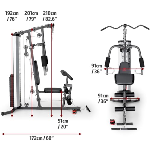 This home gym system is made out of a heavy-duty 14 gauge steel tube frame. Protective stack covers can be found on the weights for added durability. The tough frame can fully support 150-pound weights that are in constant motion. The entire home gym comes unassembled but it is easy to put together as all the required hardware is included along with instructions.