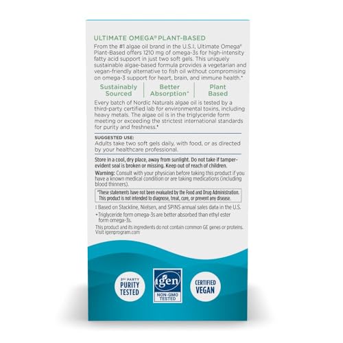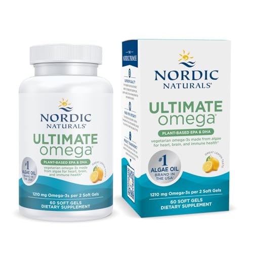 Nordic Naturals Plant Based Ultimate Omega, Lemon Flavor – 60 Vegetarian Soft Gels – 1210 mg Omega-3 – Vegan EPA and DHA – Supplement Made from Algae – Brain & Heart Support – Non-GMO – 30 Servings