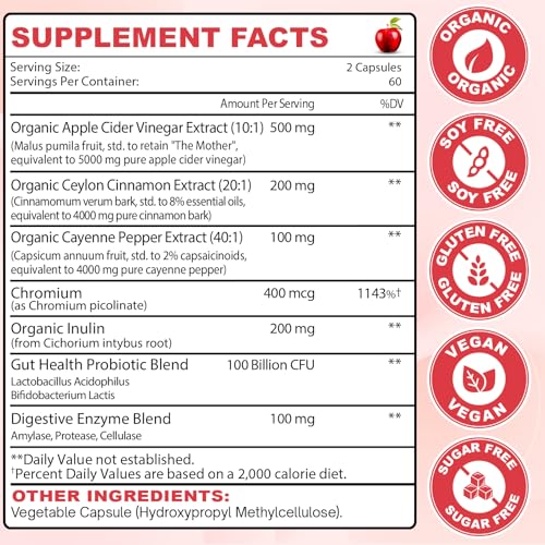 Apple Cider Vinegar Capsules 5000mg with Mother, GLP-1 Support ACV Pills Supplements with Organic Cayenne Pepper & Ceylon Cinnamon, Inulin, Probiotics for Diet, Digestion, Detox, Immune, Vegan, 120 Ct