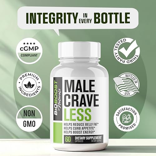 Male Crave Less – Fat Burner & Appetite Suppressant for Men to Help Shed Belly Fat, Sustain Muscle & Boost Energy | 3rd Party Tested Supplement – 60 Weight Loss Pills to Help Lose Weight