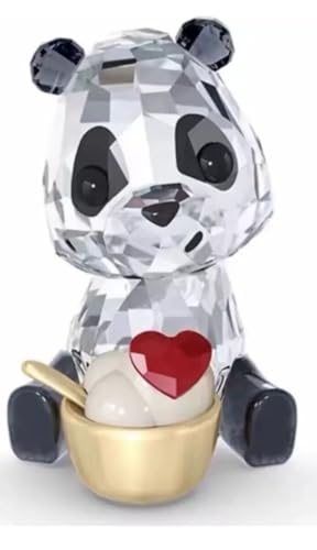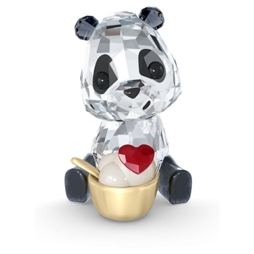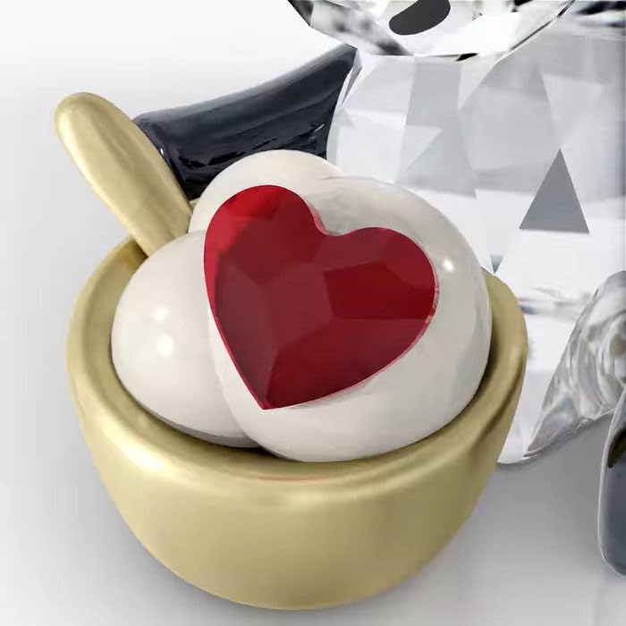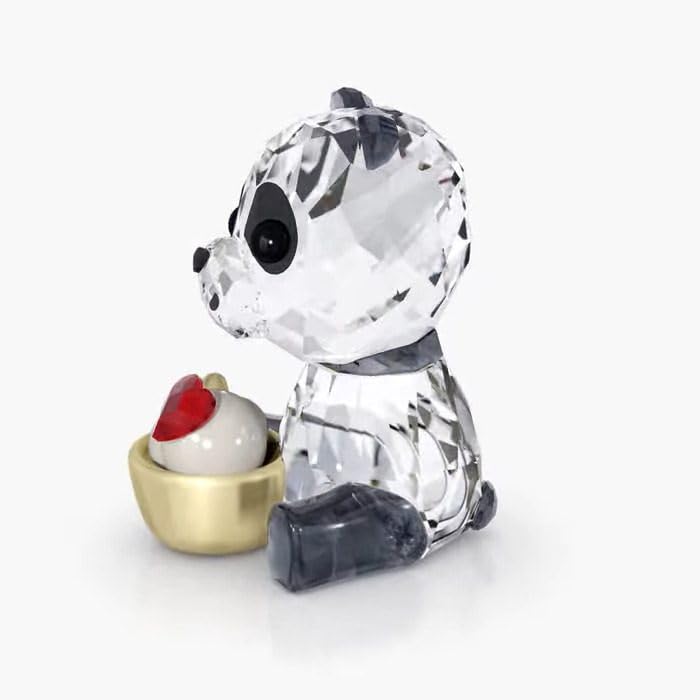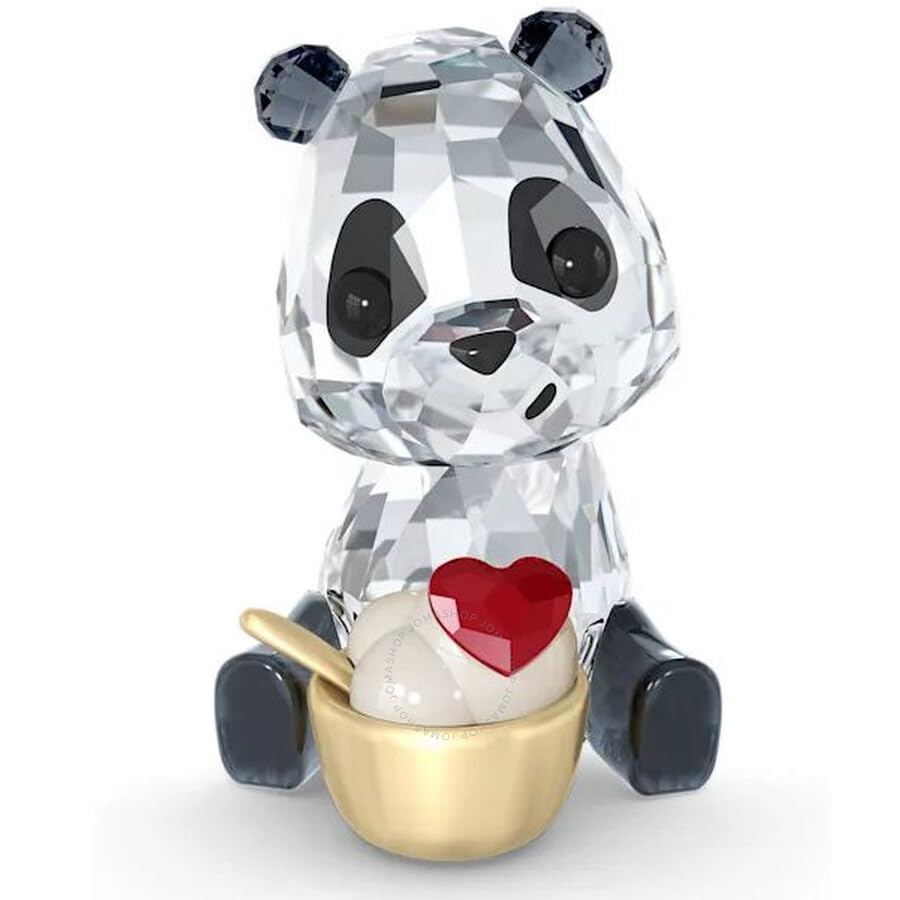 Swarovski Crystal Cariti Panda Figurine. This Panda figurine features him munching on a bowl of red-bean-flavored scoops of ice cream and is crafted in clear, grey (gray) and black cut crystal, holds a bowl in golden-lacquered metal. The ice cream within the bowl is designed in white-lacquered metal and topped with a red, heart-shaped, fancy-cut stone. Designer: Alice dal Verme. Introduced: 2023. Height: 3.3 cm x Width: 2.6 cm x Length: 2.2 cm.